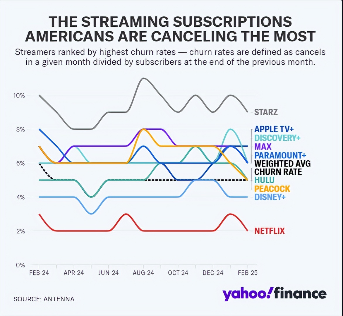 TV+的月度用户流失率高达6%,是Disney+(3%)的两倍,Netflix(2%)的三倍。用户们往往在观看完某部热门剧集后就退订了,这背后是其内容库体量过小的硬伤。由于坚持不采购外部老片库,Apple